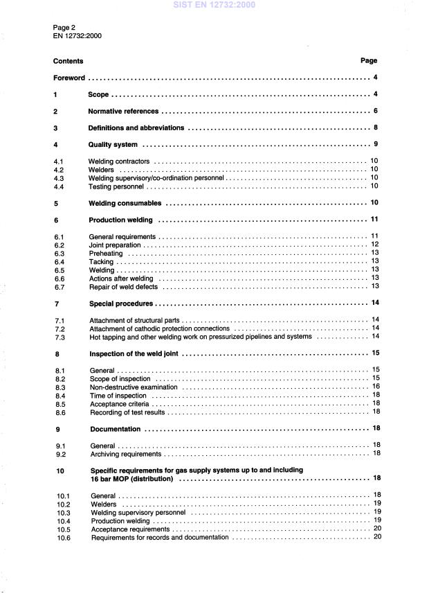 EN 12732:2000 is a standard published by the European Committee for Standardization (CEN). Its full title is "Gas supply systems - Welding steel pipework - Functional requirements". This standard covers: This European Standard contains requirements for the production and testing of weld joints for the installation and modification of onshore steel pipelines and pipework used in gas supply systems, including in-service pipelines, for all pressure ranges for the carriage of processed, non-toxic and non-corrosive natural gas according to ISO 13686.