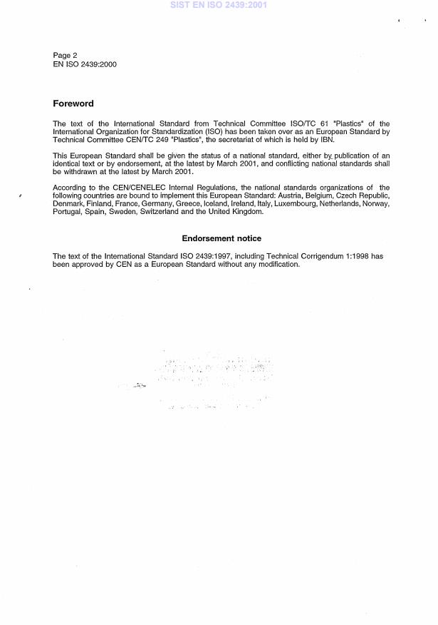 EN ISO 2439:2000 is a standard published by the European Committee for Standardization (CEN). Its full title is "Flexible cellular polymeric materials - Determination of hardness (indentation technique) (ISO 2439:1997, including Technical Corrigendum 1:1998)". This standard covers: Migrated from Progress Sheet (TC Comment) (2000-07-10): SPPJ_26_Y_199905 ++ ISO under rev: Publish 22439 and revise as soon as rev ISO published (end 1995?) ++ 2nd FV will go out on a new ISO version (CM 9512). ++ According to Mr Levio, convenor of TC 249/WG 8, the ISO Doc published contains a ++ major mistake and should not be adopted by CEN until the mistake is rectified. ++ GLG/1997-10-03