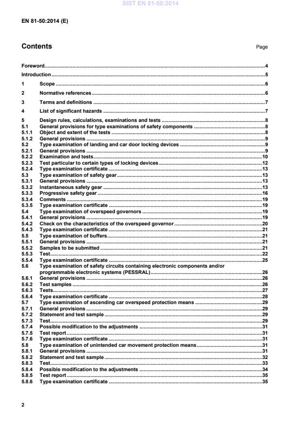 Foreword . 4 Introduction . 5 1 Scope . 6 2 Normative references . 6 3 Terms and definitions . 7 4 List of significant hazards . 7 5 Design rules, calculations, examinations and tests . 8 5.1 General provisions for type examinations of safety components . 8 5.1.1 Object and extent of the tests . 8 5.1.2 General provisions . 9 5.2 Type examination of landing and car door locking devices . 9 5.2.1 General provisions . 9 5.2.2 Examination and tests . 10 5.2.3 Test particular to certain types of locking devices . 12 5.2.4 Type examination certificate . 13 5.3 Type examination of safety gear . 13 5.3.1 General provisions . 13 5.3.2 Instantaneous safety gear . 13 5.3.3 Progressive safety gear . 16 5.3.4 Comments . 19 5.3.5 Type examination certificate . 19 5.4 Type examination of overspeed governors . 19 5.4.1 General provisions . 19 5.4.2 Check on the characteristics of the overspeed governor . 20 5.4.3 Type examination certificate . 21 5.5 Type examination of buffers . 21 5.5.1 General provisions . 21 5.5.2 Samples to be submitted . 21 5.5.3 Test . 22 5.5.4 Type examination certificate . 25 5.6 Type examination of safety circuits containing electronic components and/or programmable electronic systems (PESSRAL) . 26 5.6.1 General provisions . 26 5.6.2 Test samples . 26 5.6.3 Tests . 27 5.6.4 Type examination certificate . 28 5.7 Type examination of ascending car overspeed protection means . 29 5.7.1 General provisions . 29 5.7.2 Statement and test sample . 29 5.7.3 Test . 29 5.7.4 Possible modification to the adjustments . 31 5.7.5 Test report . 31 5.7.6 Type examination certificate . 31 5.8 Type examination of unintended car movement protection means . 31 5.8.1 General provisions . 31 5.8.2 Statement and test sample . 32 5.8.3 Test . 33 5.8.4 Possible modification to the adjustments . 34 5.8.5 Test report . 35 5.8.6 Type examination certificate . 35 SIST EN 81-50:2014