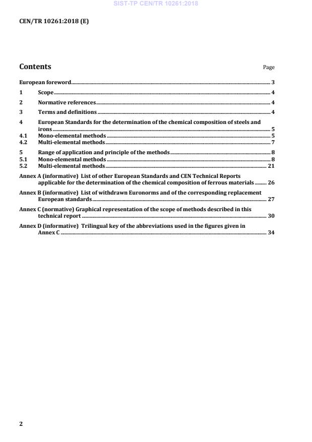 This document lists, under Clause 4, the European Standards which are currently available for the determination of the chemical composition of steels and cast irons. In Clause 5, this document provides details on the range of application and gives the principle of the method described in each standard. Items which are under preparation as European Standards or as CEN Technical Reports by ECISS/TC 102 are available on the webpage of CEN, through the link https://standards.cen.eu/dyn/www/f?p=204:22:0::::FSP_ORG_ID:733643&cs=123E58BF77E3DE921F548B80C5FF2E5D4. Annex A gives a list of other European Standards and CEN Technical Reports applicable for the determination of the chemical composition of steels and cast irons. Annex B gives a list of withdrawn Euronorms, together with the corresponding replacement European Standards, if any. Annex C shows graphical representations of the content ranges of the methods listed in this document. Figure C.1 gives the content ranges of the referee methods, Figure C.2 gives the content ranges of the routine methods and Figure C.3 represents the fields of application of all the methods described. Annex D provides a trilingual key of the abbreviations used in the Figures given in Annex C. NOTE Three methods applicable for the analysis of some ferro-alloys are listed in Annex A.