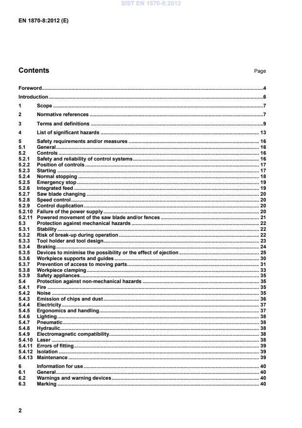 This document applies to machines where the workpiece is stationary, the vertical and horizontal movements of the saw unit are power driven, and where the machine is provided with workpiece clamping. The workpiece may or may not be clamped during cutting. This document does not apply to machines: where the workpiece is fed to the saw blade during cutting; designed for cutting veneers; provided with a device situated behind the line of cut, which moves in a direction parallel to the line of cut, for automatically unloading the workpiece during the return of the saw unit to the rest position. This document is not applicable to machines manufactured before its date of publication as EN. 2 Normative references The following documents, in whole or in part, are normatively referenced in this document and are indispensable for its application. For dated references, only the edition cited applies. For undated references, the latest edition of the referenced document (including any amendments) applies. EN 349:1993+A1:2008, Safety of machinery —Minimum gaps to avoid crushing of parts of the human body EN 614-1:2006+A1:2009, Safety of machinery — Ergonomic design principles — Part 1: Terminology and general principles EN 614-2:2000+A1:2008, Safety of machinery — Ergonomic design principles — Part 2: Interactions between the design of machinery and work tasks EN 847-1:2005+A1:2007, Tools for woodworking — Safety requirements — Part 1: Milling tools, circular saw blades EN 894-1:1997+A1:2008, Safety of machinery — Ergonomics requirements for the design of displays and control actuators — Part 1: General principles for human interactions with displays and control actuators EN 894-2:1997+A1:2008, Safety of machinery — Ergonomics requirements for the design of displays and control actuators — Part 2: Displays EN 894-3:2000+A1:2008, Safety of machinery — Ergonomics requirements for the design of displays and control actuators — Part 3: Control actuators EN 1005-1:2001+A1:2008, Safety of machinery — Human physical performance — Part 1: Terms and definitions EN 1005-2:2003+A1:2008, Safety of machinery — Human physical performance — Part 2: Manual handling of machinery and component parts of machinery SIST EN 1870-8:2013
