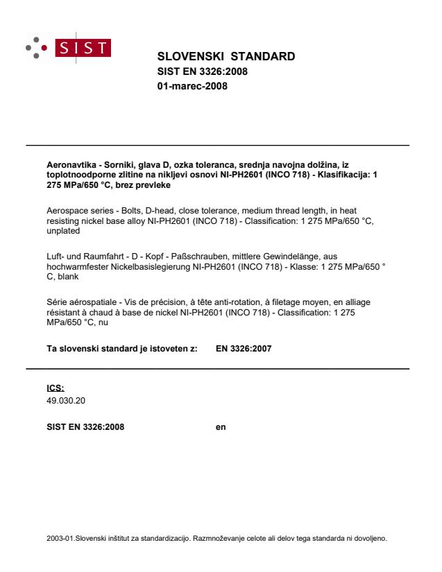 2003-01.Slovenski inštitut za standardizacijo. Razmnoževanje celote ali delov tega standarda ni dovoljeno.Aerospace series - Bolts, D-head, close tolerance, medium thread length, in heat resisting nickel base alloy NI-PH2601 (INCO 718) - Classification: 1 275 MPa/650 °C, unplatedAeronavtika - Sorniki, glava D, ozka toleranca, srednja navojna dolžina, iz toplotnoodporne zlitine na nikljevi osnovi NI-PH2601 (INCO 718) - Klasifikacija: 1 275 MPa/650 °C, brez prevlekeSérie aérospatiale - Vis de précision, à tête anti-rotation, à filetage moyen, en alliage résistant à chaud à base de nickel NI-PH2601 (INCO 718) - Classification: 1 275 MPa/650 °C, nuLuft- und Raumfahrt - D - Kopf - Paßschrauben, mittlere Gewindelänge, aus hochwarmfester Nickelbasislegierung NI-PH2601 (INCO 718) - Klasse: 1 275 MPa/650 °C, blankTa slovenski standard je istoveten z:EN 3326:2007SIST EN 3326:2008en49.030.20ICS:SLOVENSKI