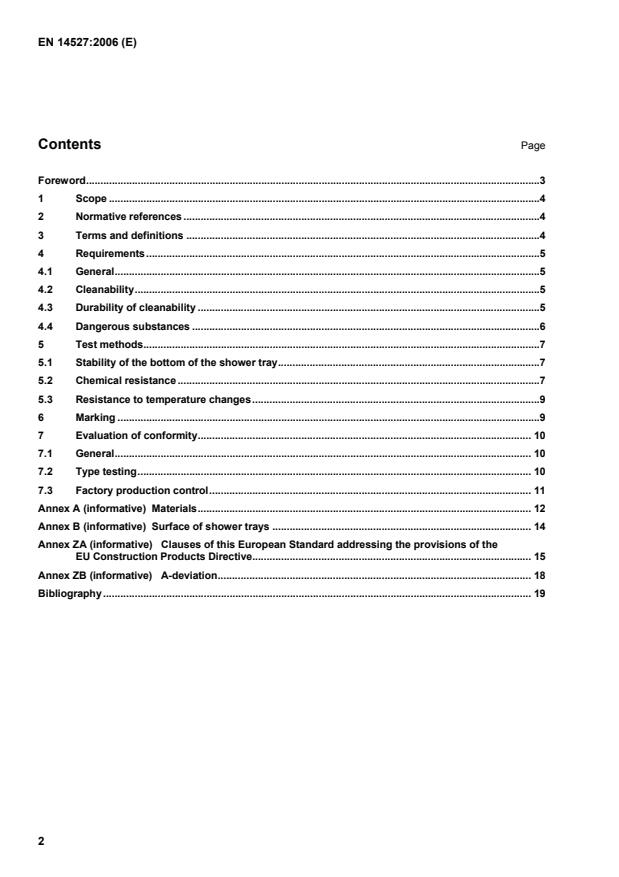 EN 14527:2006 is a standard published by the European Committee for Standardization (CEN). Its full title is "Shower trays for domestic purposes". This standard covers: This European Standard specifies requirements, test methods and procedures for evaluation of conformity for shower trays used for domestic purposes which ensure that the product, when installed, used and maintained in accordance with the manufacturer's instructions, will satisfy cleanability and durability of cleanability when used for personal hygiene. This standard is applicable to all sizes and shapes of shower trays. This standard does not cover shower trays for use with medical provisions. NOTE 1 For the purpose of this standard the term "domestic purposes" includes use in hotels, accommodation for students, hospitals and similar buildings. NOTE 2 Annex A lists characteristics of materials commonly used for manufacturing shower trays.