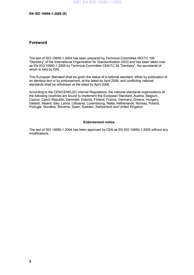 as EN ISO 10650-1:2005 by Technical Committee CEN/TC 55 "Dentistry", the secretariat of