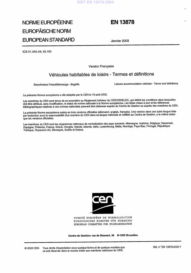EN 13878:2003 is a standard published by the European Committee for Standardization (CEN). Its full title is "Leisure accommodation vehicles - Terms and definitions". This standard covers: This draft European Standard defines terms relating to leisure accommodation vehicles used in EN 721, EN 722-1, EN 1645-1, EN 1645-2, EN 1646-1, EN 1646-2, EN 1647, EN 1648-1 and EN 1648-2. NOTE Leisure accommodation vehicles (see also 3.21) are cara-vans (see 3.5), caravan holiday homes (see 3.6) and motor cara-vans (see 3.26).