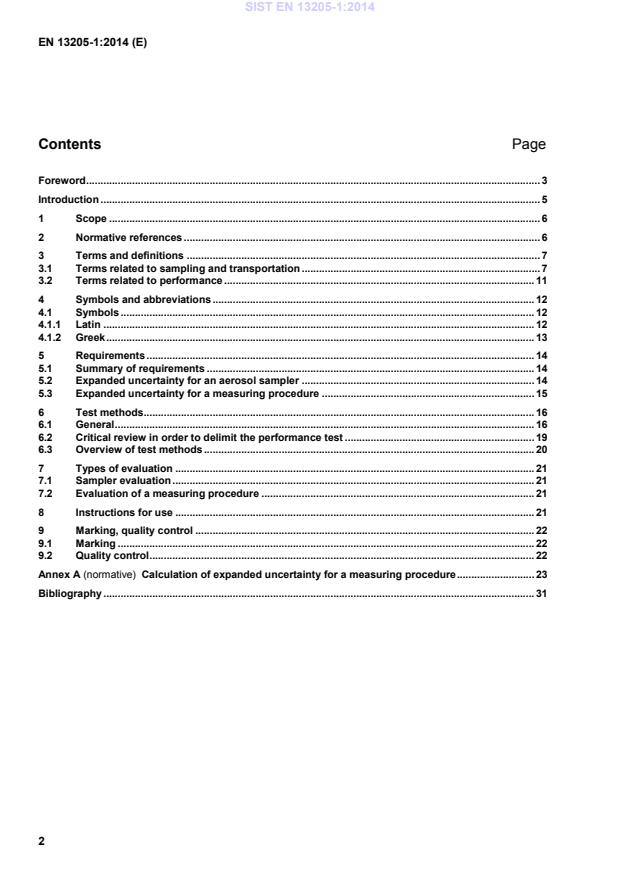 Introduction . 5 1 Scope . 6 2 Normative references . 6 3 Terms and definitions . 7 3.1 Terms related to sampling and transportation . 7 3.2 Terms related to performance . 11 4 Symbols and abbreviations . 12 4.1 Symbols . 12 4.1.1 Latin . 12 4.1.2 Greek . 13 5 Requirements . 14 5.1 Summary of requirements . 14 5.2 Expanded uncertainty for an aerosol sampler . 14 5.3 Expanded uncertainty for a measuring procedure . 15 6 Test methods . 16 6.1 General . 16 6.2 Critical review in order to delimit the performance test . 19 6.3 Overview of test methods . 20 7 Types of evaluation . 21 7.1 Sampler evaluation . 21 7.2 Evaluation of a measuring procedure . 21 8 Instructions for use . 21 9 Marking, quality control . 22 9.1 Marking . 22 9.2 Quality control . 22 Annex A (normative)