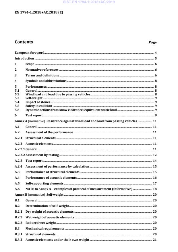 Resistance against wind load and load from passing vehicles . 11 A.1 General . 11 A.2 Assessment of the performance . 11 A.2.1 Structural elements . 11 A.2.2 Acoustic elements . 11 A.2.2.1 General . 11 A.2.2.2 Assessment by testing . 12 A.2.3 Test report . 14 A.2.4 Assessment of performance by calculation . 15 A.3 Performance of structural elements . 15 A.4 Performance of acoustic elements . 16 A.5 Self-supporting elements . 17 A.6 NOTE to Annex A – examples of protocol of measurement (informative) . 18 Annex B (normative)