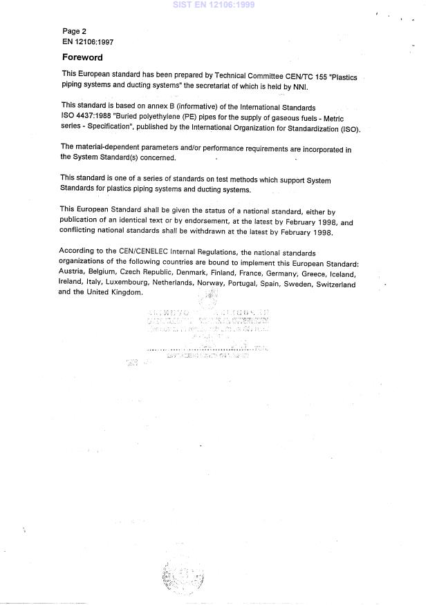 EN 12106:1997 is a standard published by the European Committee for Standardization (CEN). Its full title is "Plastics piping systems - Polyethylene (PE) pipes - Test method for the resistance to internal pressure after application of squeeze-off". This standard covers: This standard specifies a method for determining the resistance to internal pressure of polyethylene (PE) pipes after being subjected to a sqeeze-off procedure and then tested for hydrostatic strength.