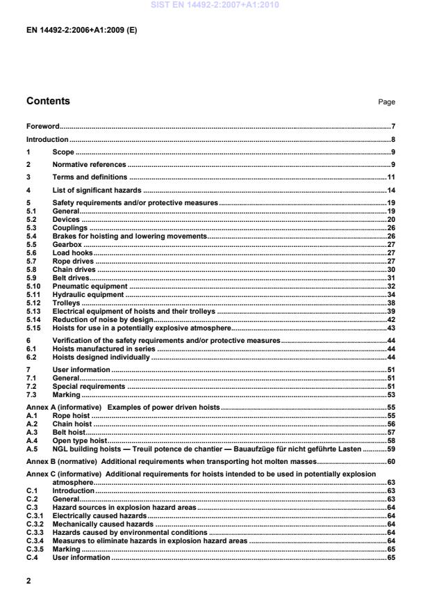 Additional requirements for hoists intended to be used in potentially explosion atmosphere . 63C.1Introduction . 63C.2General . 63C.3Hazard sources in explosion hazard areas . 64C.3.1Electrically caused hazards . 64C.3.2Mechanically caused hazards . 64C.3.3Hazards caused by environmental conditions . 64C.3.4Measures to eliminate hazards in explosion hazard areas . 64C.3.5Marking . 65C.4User information . 65SIST EN 14492-2:2007+A1:2010