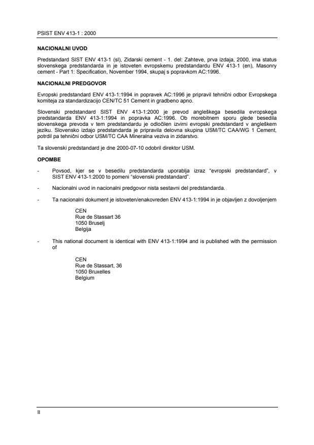 Slovenski predstandard SIST ENV 413-1:2000 je prevod angleškega besedila evropskega