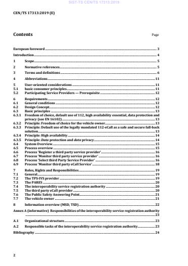 CEN/TS 17313:2019 is a technical specification published by the European Committee for Standardization (CEN). Its full title is "Intelligent transport systems - ESafety - Interoperability and user choice in eCall aftermarket and third party eCall services". This standard covers: This document provides a description for voluntarily consenting vendors (subsequently referred to as 'participating service providers’), who wish to provide TPS-eCall service in an open market environment, where users can select and change the service provider. It focusses on the use case 'TPS-eCall service', as standardized in EN 16102, only (and for clarification, does not apply in respect of 112-eCall, where no TPS provider is involved.) The document determines the preconditions, requirements and functional means needed in order that users of a TPS-eCall service can choose and change her/his preferred service provider (TPSP) out of a range of available TPSPs, who are participating in the open market provisions determined in this specification. Outside the scope of this document are: a) any commercial considerations (e.g. whether the service is offered for free or a charged service or part of a commercial service package offer), b) any contractual considerations (e.g. how a service contract between an user and a TPSP is established), c) any IT-security related issues in conjunction with the TPS in-vehicle system, d) any considerations regarding communication costs (for voice and data) related to the TPS-eCall service e) any PSAP related considerations (towards the PSAPs there is no impact related to provider change, since any TPSP needs to negotiate acceptance of its service offering with the PSAPs in the countries where the service is provided, before such service can be provided).
