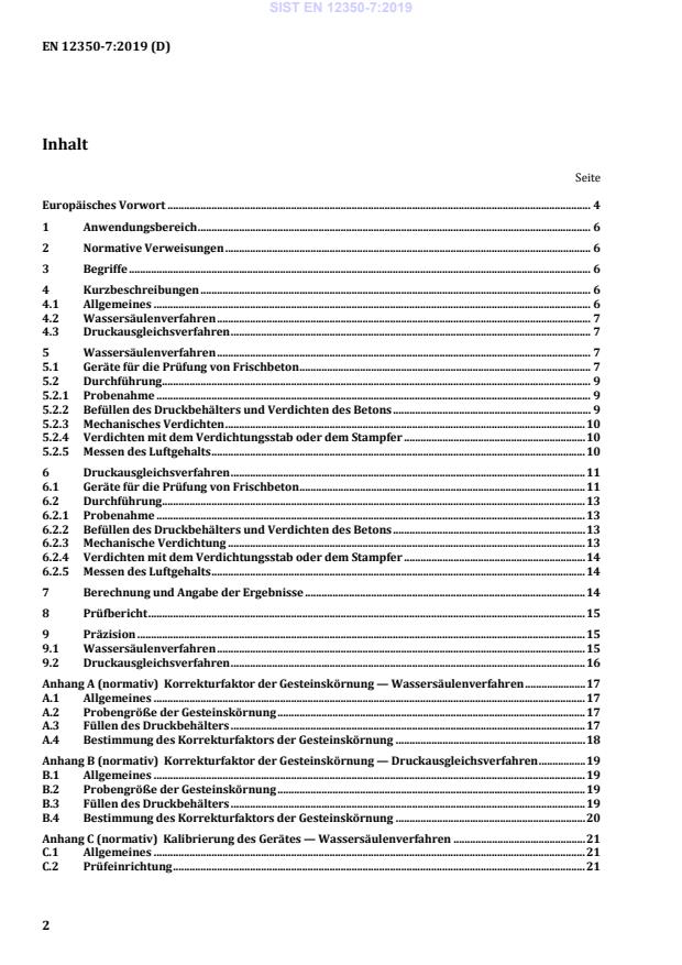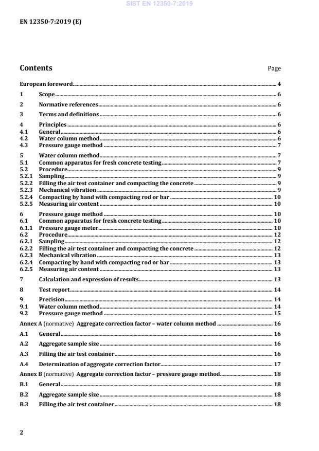 This document describes two methods for determination of air content of compacted fresh concrete, made with normal weight or relatively dense aggregate and having a declared value of D of the coarsest fraction of aggregates actually used in the concrete (Dmax) not greater than 63 mm. The test is not suitable for concretes with slumps less than 10 mm according to EN 12350-2. Neither method is applicable to concretes made with lightweight aggregates, air cooled blast-furnace slag, or aggregates with high porosity, because of the magnitude of the aggregate correction factor, compared with the entrained air content of the concrete.
