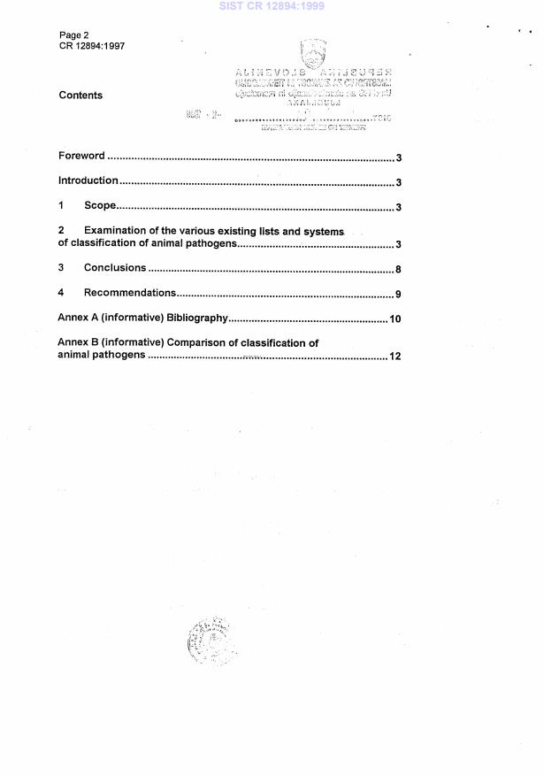 CR 12894:1997 is a standardization document published by the European Committee for Standardization (CEN). Its full title is "Biotechnology - Microorganisms - Examination of the various existing lists of animal pathogens and production of a report". This standard covers: No scope available