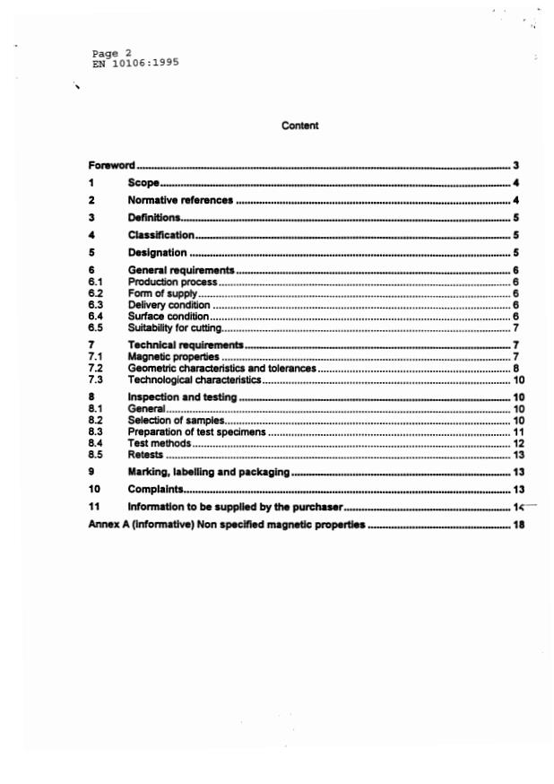 EN 10106:1995 is a standard published by the European Committee for Standardization (CEN). Its full title is "Cold rolled non-oriented electrical steel sheet and strip delivered in the fully processed state". This standard covers: This European Standard defines the grades of cold-rolled non-oriented electrical steel sheet and strip in nominal thicknesses of 0,35mm, 0,50mm,0,65 mm and 1,00mm. In particular, it specifies general requirements, the magnetic properties, geometric characteristics and tolerances, technological characteristics as well as the inspection procedure. This European Standard applies to materials supplied in the fully annealed condition intended for the construction of magnetic circuits. It does not apply to semi-processed material. These magnetic materials correspond to Clause C21 of IEC 404-1.