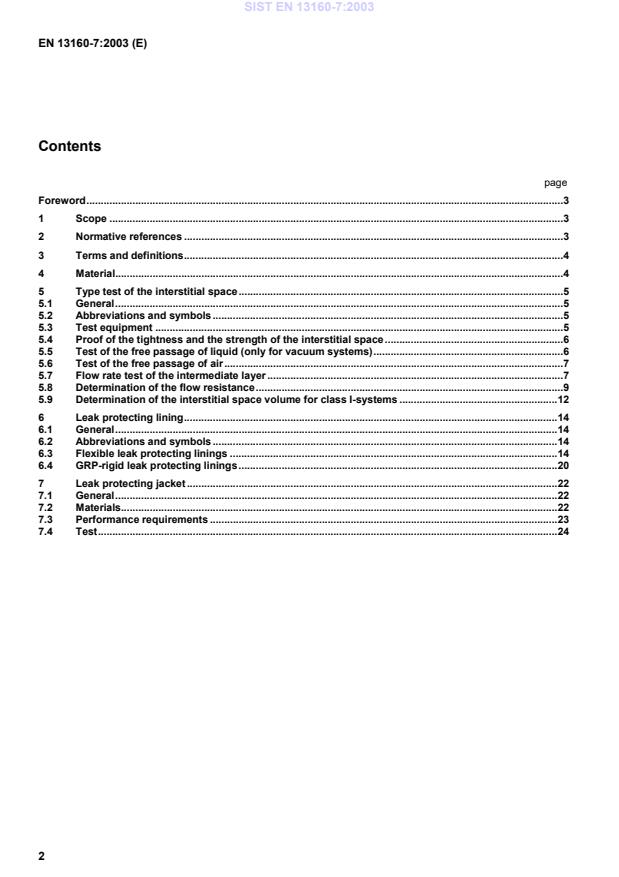 EN 13160-7:2003 is a standard published by the European Committee for Standardization (CEN). Its full title is "Leak detection systems - Part 7: General requirements and test methods for interstitial spaces, leak protecting linings and leak protecting jackets". This standard covers: This standard specifies the type test of the interstitial space and the general requirements and test methods for leak protecting linings and leak protecting jackets which are parts of leak detection systems.