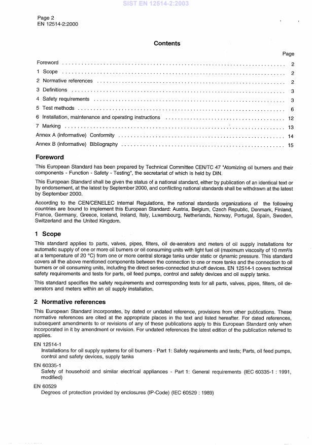 EN 12514-2:2000 is a standard published by the European Committee for Standardization (CEN). Its full title is "Installations for oil supply systems for oil burners - Part 2: Safety requirements and tests - Parts, valves, pipes, filters, oil de-aerators, meters". This standard covers: This standard applies to valves, pipes, filters and meters of oil supply installations for automatic supply of one or more oil burners or oil consuming units with fuel oil from one or more central storage tanks under static or dynamic pressure. This standard covers all the above mentioned components between the connection to one or more tanks and the connection to oil burners or oil consuming units, including the direct series-connected shut-off devices.