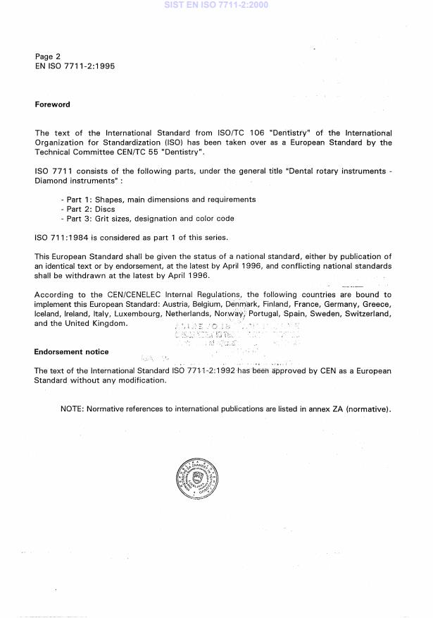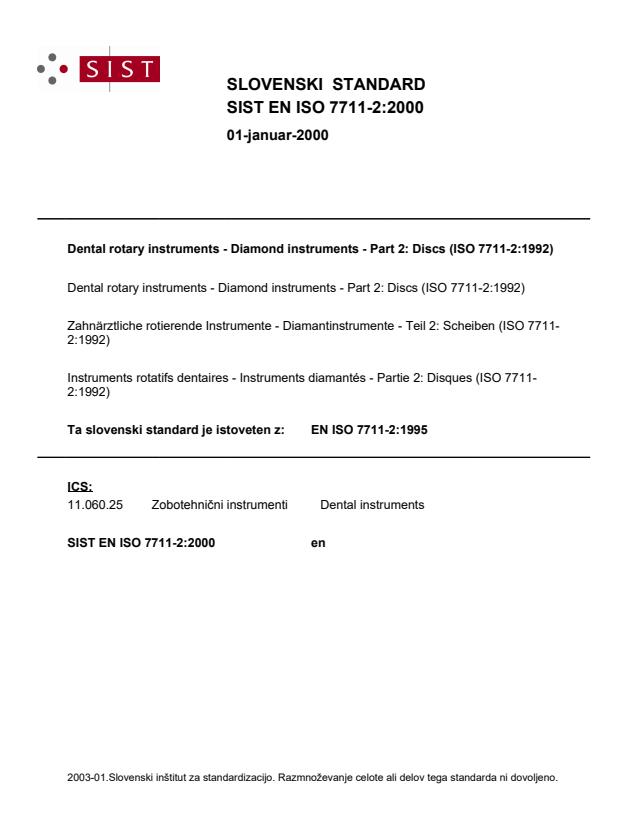 INTERNATIONAL STANDARD 7711-2 First edition 1992-l 2-l 5 Dental rotary instruments - Diamond instruments - Part 2: Discs Instruments rotatifs dentaires - Instruments diamantes - Partie 2: Disques - Reference number IS0 77 11-2:1992(E) SIST EN ISO 7711-2:2000