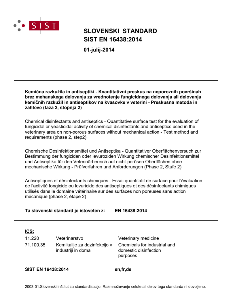 2003-01.Slovenski inštitut za standardizacijo. Razmnoževanje celote ali delov tega standarda ni dovoljeno.Chemische Desinfektionsmittel und Antiseptika - Quantitativer Oberflächenversuch zur Bestimmung der fungiziden oder levuroziden Wirkung chemischer Desinfektionsmittel und Antiseptika für den Veterinärbereich auf nicht-porösen Oberflächen ohne mechanische Wirkung - Prüfverfahren und Anforderungen (Phase 2, Stufe 2)Antiseptiques et désinfectants chimiques - Essai quantitatif de surface pour l'évaluation de l'activité fongicide ou levuricide des antiseptiques et des désinfectants chimiques utilisés dans le domaine vétérinaire sur des surfaces non poreuses sans action mécanique (phase 2, étape 2)Chemical disinfectants and antiseptics - Quantitative surface test for the evaluation of fungicidal or yeasticidal activity of chemical disinfectants and antiseptics used in the veterinary area on non-porous surfaces without mechanical action - Test method and requirements (phase 2, step2)71.100.35Kemikalije za dezinfekcijo v industriji in domaChemicals for industrial and domestic disinfection purposes11.220VeterinarstvoVeterinary medicineICS:Ta slovenski standard je istoveten z:EN 16438:2014SIST EN 16438:2014en,fr,de01-julij-2014SIST EN 16438:2014SLOVENSKI