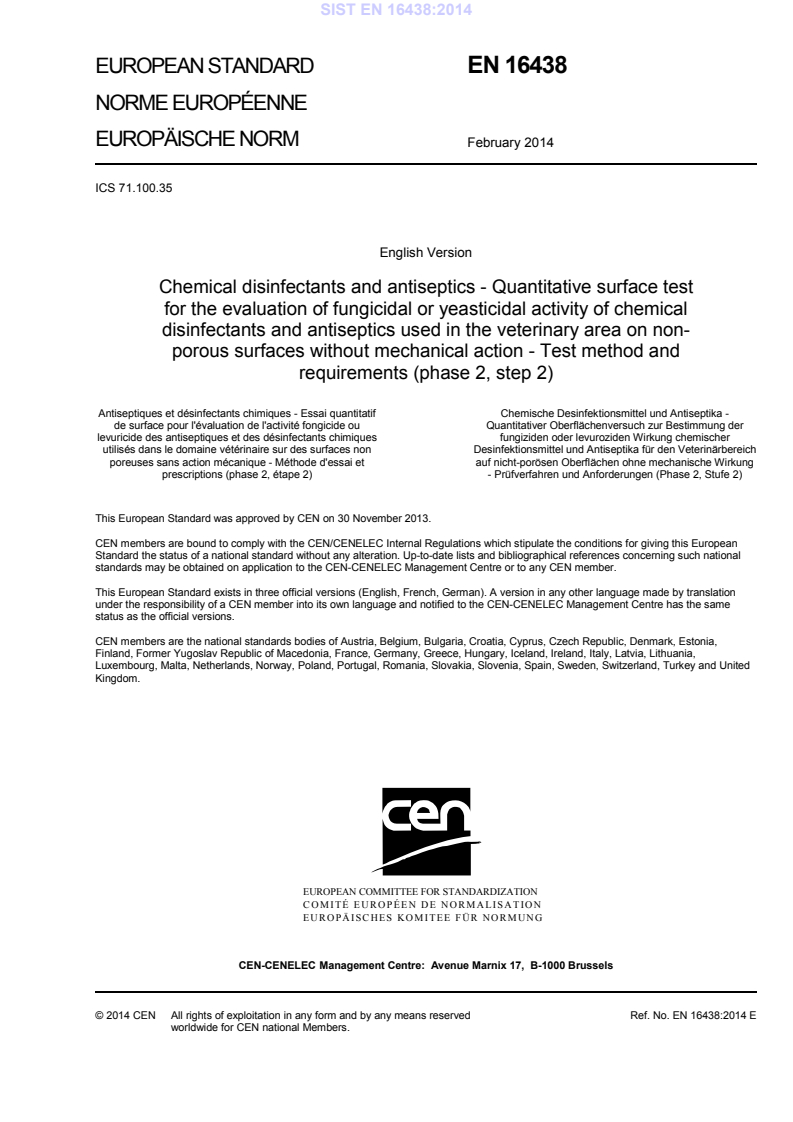EN 16438:2014 is a standard published by the European Committee for Standardization (CEN). Its full title is "Chemical disinfectants and antiseptics - Quantitative surface test for the evaluation of fungicidal or yeasticidal activity of chemical disinfectants and antiseptics used in the veterinary area on non-porous surfaces without mechanical action - Test method and requirements (phase 2, step 2)". This standard covers: This European Standard specifies a test method and the minimum requirements for fungicidal or yeasticidal activity of chemical disinfectant and antiseptic products that form a homogeneous physically stable preparation in hard water or in the case of ready-to-use products with water. This European Standard applies to products for use in the veterinary area i.e. in the breeding, husbandry, production, transport and disposal of all animals except when in the food chain following death and entry to the processing industry. EN 14885 specifies in detail the relationship of the various tests to one another and to use recommendations. NOTE 1 The method described is intended to determine the activity of commercial formulations or active substances under the conditions in which they are used. NOTE 2 This method corresponds to a Phase 2 Step 2 test.