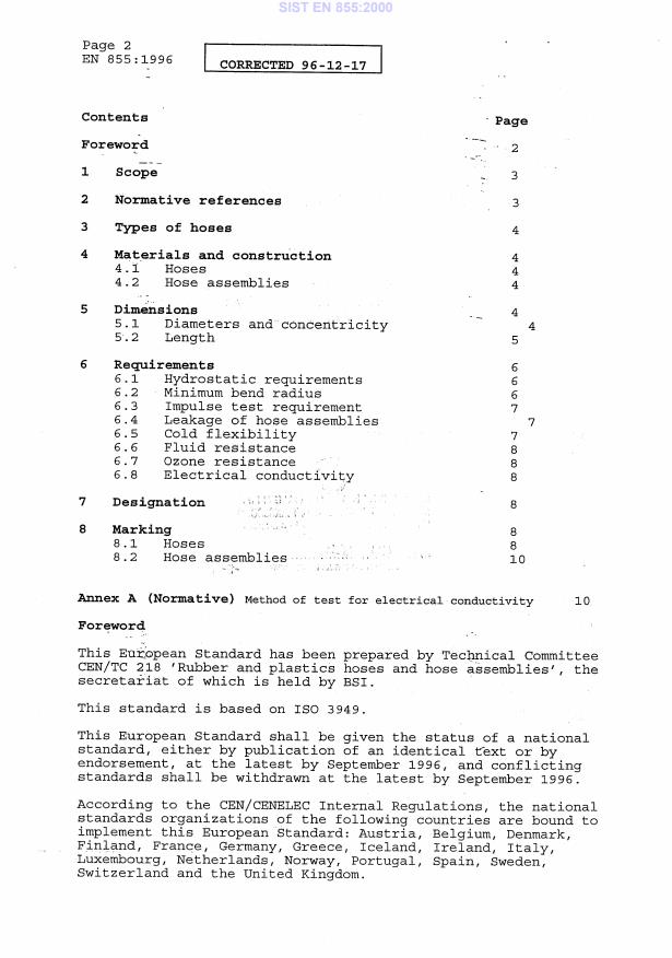 EN 855:1996 is a standard published by the European Committee for Standardization (CEN). Its full title is "Plastics hoses and hose assemblies - Thermoplastics textile reinforced hydraulic type - Specification". This standard covers: This European standard specifies requirements for two types of textile reinforced thermoplastics hoses and hose assemblies with maximum working pressures in the range of 69 bar to 345 bar. They are suitable for use with: - petroleum and synthetic based hydraulic fluids at temperatures ranging from -40°C to +100°C; - water based hydraulic fluids at temperatures ranging from 0 °C to +70 °C. The Standard does not include requirements for end fittings. It is limited to the performance of hoses and hose assemblies.