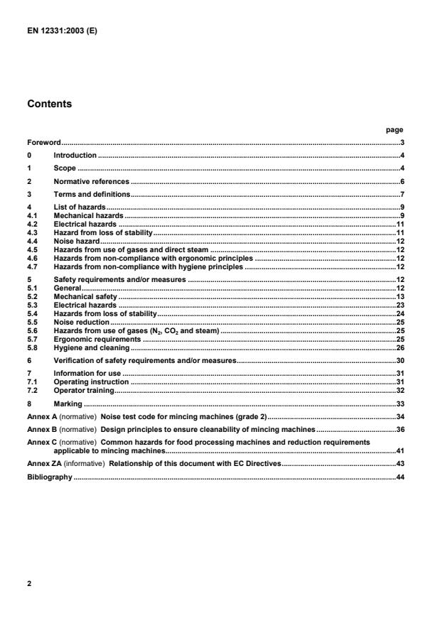 EN 12331:2003 is a standard published by the European Committee for Standardization (CEN). Its full title is "Food processing machinery - Mincing machines - Safety and hygiene requirements". This standard covers: 1.1 This European Standard specifies requirements for the design and manufacture of mincing machines (see Figures 1 and 2) used in a stationary position. The machines covered by this standard are used for size reduction of fresh or frozen meat, meat products and fish by cutting in a set of cutting tools. Mincing machines for domestic uses are not included in this standard. Filling mincers are covered by prEN 12463 "Food processing machinery - Filling machines and auxiliary machines - Safety and hygiene requirements". This standard applies only to machines that are manufactured after the date of issue of this standard. Mincing machines in connection with using a hold to run foot switch are not covered by this standard. 1.2 This standard covers the following types: - Mincing machine with tray, feed intake and pusher, diameter < 52 mm on feed intake (see Figure 5) - Mincing machine with tray, feed intake, restrictor plate and pusher, diameter > 52 mm on feed intake (see Figure 6) - Mincing machine with feed intake hopper and cover, screw conveyor, with1) or without mixing screw in feed intake hopper (see Figure 7) - Mincing machine with feed intake hopper, with or without cover, screw conveyor, with ) or without mixing screw in feed intake hopper, with loading device (continuously or discontinuously) Mincing machines comprise a machine base, a worm casing with a worm, a feed intake tray or hopper, a screw conveyor (and sometimes an additional mixing screw in the feed intake hopper), a set of cutting tools, a lock nut, a loading device, a drive motor and, depending on machine type, electrical, hydraulic and pneumatic components. They will also have various safeguarding devices as examples in clause 5. Mincing machines may be equipped e.g. with - an extraction claw, - an ejector or extractor, - a protective hood over the discharge outlet, - a cover over the inlet opening of the feed intake hopper, - a transport carriage for the lock nut, the set