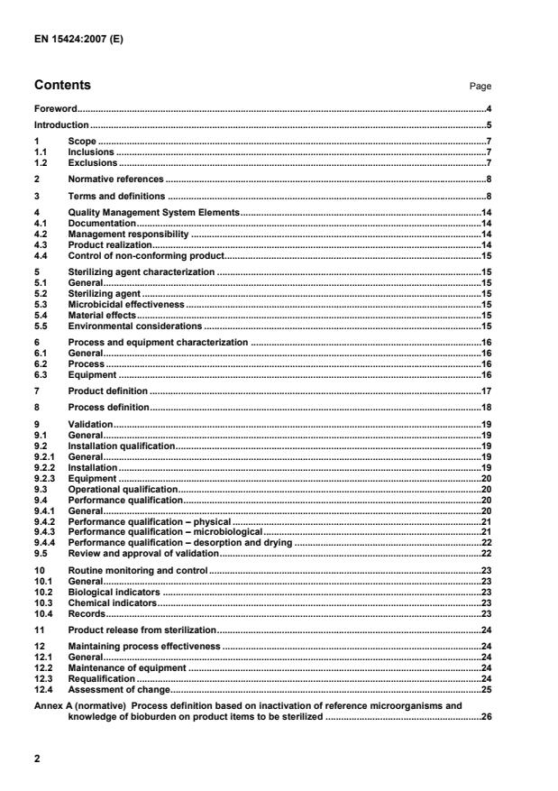 Guidance on application of this European Standard.30 C.1 Scope.30 C.2 Normative references.30 C.3 Terms and definitions.30 C.4 Quality management system elements.30 C.5 Sterilizing agent characterization.30 C.5.1 Neutralization.30 C.5.2 Studies of microbial inactivation.31 C.6 Process and equipment characterization.31 C.7 Product definition.31 C.7.1 General.31 C.7.2 Design considerations for medical devices intended for sterilization.32 C.7.3 Packaging considerations.32 C.8 Process definition.32 C.8.1 General.32 C.8.2 Influence on product and packaging.33 C.8.3 Determination of process effectiveness.33 C.9 Validation.34 C.9.1 General.34 C.9.2 Installation qualification (IQ).34 C.9.3 Operational qualification (OQ).35 C.9.4 Performance qualification (PQ).36 C.9.5 Documentation and approval of validation.37 C.10 Routine monitoring and control.37 C.11 Product release from sterilization.38 C.11.1 General.38 C.11.2 Product release using biological indicators.38 C.11.3 Parametric release.38 C.12 Maintaining process effectiveness.38 C.12.1 Change control.38 C.12.2 Requalification.39 Annex D (informative)