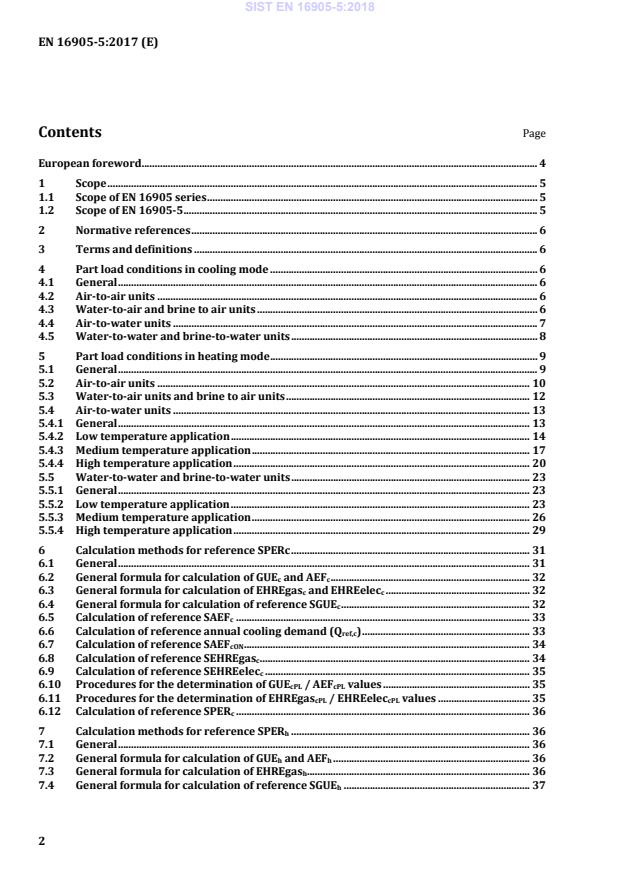 Fixed outlet °C Variable outlet °C A (35–16)/(Tdesignc-16) 100 35 12/7 12/7 23/18 B (30–16)/(Tdesignc-16) 74 30 a/7 a/8,5 a/18 C (25–16)/(Tdesignc-16) 47 25 a/7 a/10 a/18 D (20–16)/(Tdesignc-16) 21 20 a/7 a/11,5 a/18 a With the water flow rate as determined during “A” test for units with a fixed water flow rate or with a fixed delta T of 5 K for units with a variable water flow rate. 4.5 Water-to-water and brine-to-water units For each application, units either allowing or not allowing a variation of the outlet water temperature with the outdoor temperature are considered. The variable outlet temperature shall only be applied when the control provides a regulation of outlet water temperature that considers the outdoor temperature. The part load conditions for determining the reference SGUEc (Formula (2)), SAEFc (Formula (4)), SEHREgasc (Formula (7)), SEHREelecc (Formula (8)) are given in the following table: SIST EN 16905-5:2018