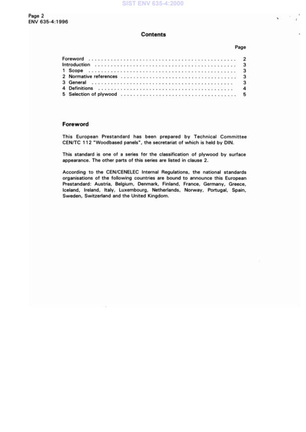 ENV 635-4:1996 is a standardization document published by the European Committee for Standardization (CEN). Its full title is "Plywood - Classification by surface appearance - Part 4: Parameters of ability for finishing - Guideline". This standard covers: This Standard gives guidance for the end user on the selection of plywood for application of various finishes for use in dry, humid, or exterior end-use conditions.