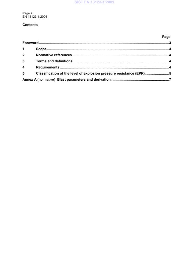 Page 2EN 13123-1:2001ContentsPageForeword.31Scope.42Normative references.43Terms and definitions.44Requirements.45Classification of the level of explosion pressure resistance (EPR).5Annex A (normative)