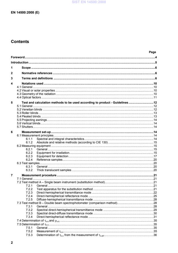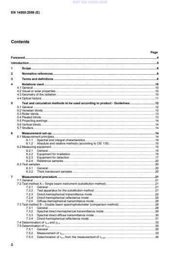 EN 14500:2008 is a standard published by the European Committee for Standardization (CEN). Its full title is "Blinds and shutters - Thermal and visual comfort - Test and calculation methods". This standard covers: This European Standard defines test and calculation methods for the determination of the reflection and transmission characteristics to be used to determine the thermal and visual comfort performance classes of external blinds, internal blinds and shutters, as specified in EN 14501. This European Standard also specifies the method to determine opacity characteristics of dim-out/black-out external blinds, internal blinds and shutters, as specified in EN 14501. This European Standard applies to the whole range of shutters, awnings and blinds defined in EN 12216, described as solar protection devices in this European Standard. Some of the characteristics (e.g. gtot) are not applicable when products are not parallel to the glazing (e.g. folding-arm awnings). NOTE Informative Annex D presents an approach for the determination of characteristics in case of projectable products. Products using fluorescent or retroreflecting materials are outside the scope of this European Standard.