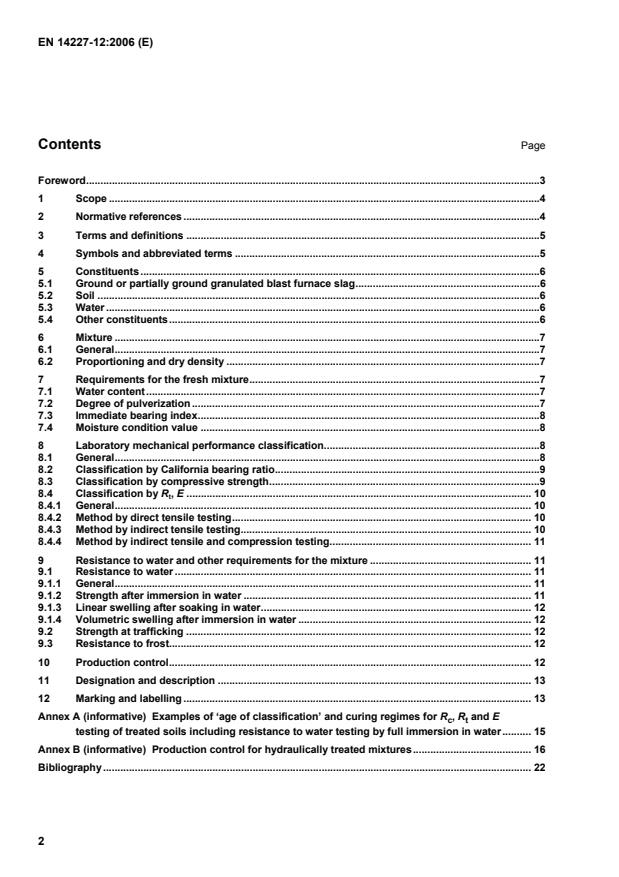 EN 14227-2 that has not been ground, although the user should be aware that mixtures containing such slag rely for their performance on crushing of the slag between soil particles under rolling which may not be achieved with some soil types. 5.2 Soil Not less than 95 % of the soil shall pass the 63 mm sieve when tested using wet sieving in conformity with EN 933-1. The soil shall conform to classification and homogeneity requirements at the place of use. NOTE 1 Organic matter can delay the setting and hardening process. Laboratory mixture design work will determine whether soil/material containing organic matter can be accommodated. The amount of organic matter that can be accommodated depends on the type of organic matter. NOTE 2 Soil containing or suspected of containing sulphates can result in expansion of the mixture. Laboratory mixture design work including ‘resistance to water testing’ in accordance with this European Standard will determine if sulfates or other material with the potential to cause swelling can be accommodated. 5.3 Water Water shall not contain components that adversely affect the setting, hardening and performance of the mixture. 5.4 Other constituents Other constituents shall include lime in conformity with EN 14227-11, cement in conformity with EN 197-1, aggregate, gypsum, ground or crushed air-cooled steel slag or other materials that are either necessary for setting and hardening of the mixture or to improve workability, trafficability or performance. NOTE Other constituents include those that are necessary for the setting and hardening of the slag e.g. a source of lime and or sulfate, and those constituents that are added to improve workability, traffickability and or performance of the mixture e.g. aggregate.