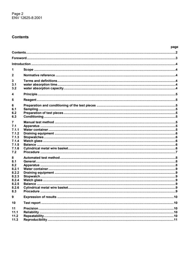 ENV 12625-8:2001 is a standardization document published by the European Committee for Standardization (CEN). Its full title is "Tissue paper and tissue products - Part 8: Water absorption time, water absorption capacity - Manual and automated test method". This standard covers: The purpose of this part of EN 12625 is to determine, on the same sample: - water absorption rate; - water absorption capacity. This test method covers the evaluation of the behaviour of tissue paper and tissue products in the presence of water.