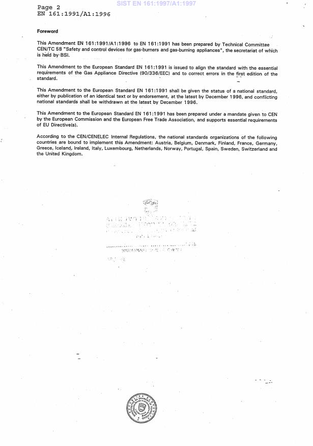 EN 161:1991/A1:1996 is associated with the following European legislation: EU Directives/Regulations: 90/396/EEC; Standardization Mandates: M/BC/CEN/89/6. When a standard is cited in the Official Journal of the European Union, products manufactured in conformity with it benefit from a presumption of conformity with the essential requirements of the corresponding EU directive or regulation.