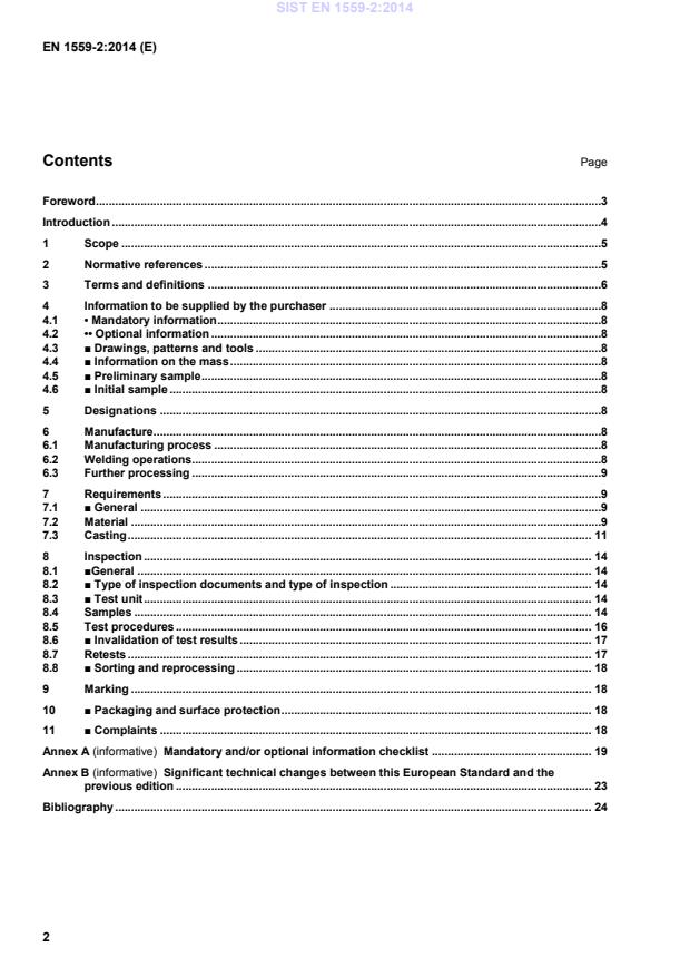 EN 1559-2:2014 is a standard published by the European Committee for Standardization (CEN). Its full title is "Founding - Technical conditions of delivery - Part 2: Additional requirements for steel castings". This standard covers: This part of EN 1559 specifies the additional technical delivery conditions for steel castings unless other conditions have been agreed at the time of enquiry and order. This European Standard is also applicable to nickel and cobalt alloy castings.