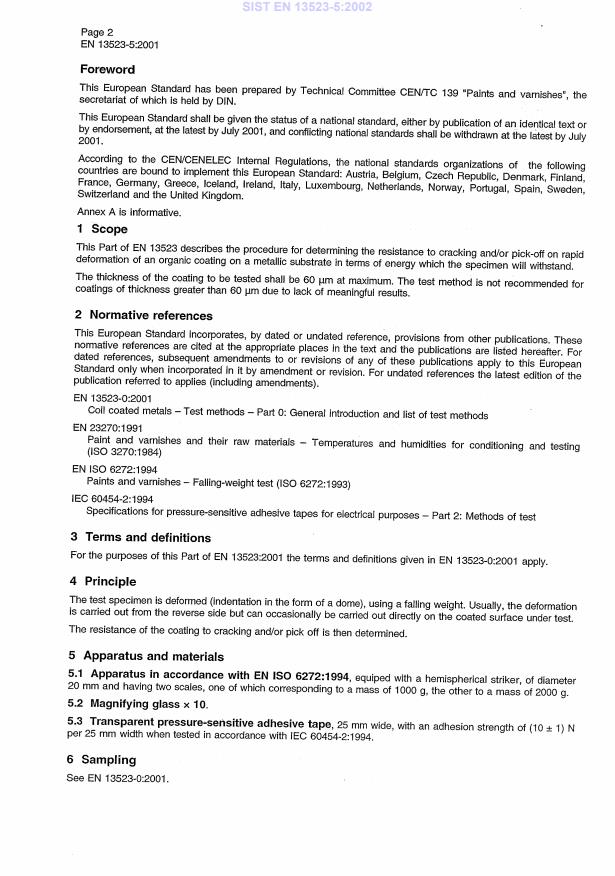 EN 13523-5:2001 is a standard published by the European Committee for Standardization (CEN). Its full title is "Coil coated metals - Test methods - Part 5: Resistance to rapid deformation (impact test)". This standard covers: This part of EN 13523 describes the procedure for determining the resistance to cracking and/or pick off on rapid deformation of an organic coating on a metallic substrate in terms of energy which the specimen will withstand. The thickness of the coating to be tested shall be 60 micronmillimeters at maximum. The test procedures is not recommended for coatings of thickness greater then 60 micronmillimeters due to lack of meaningful results.