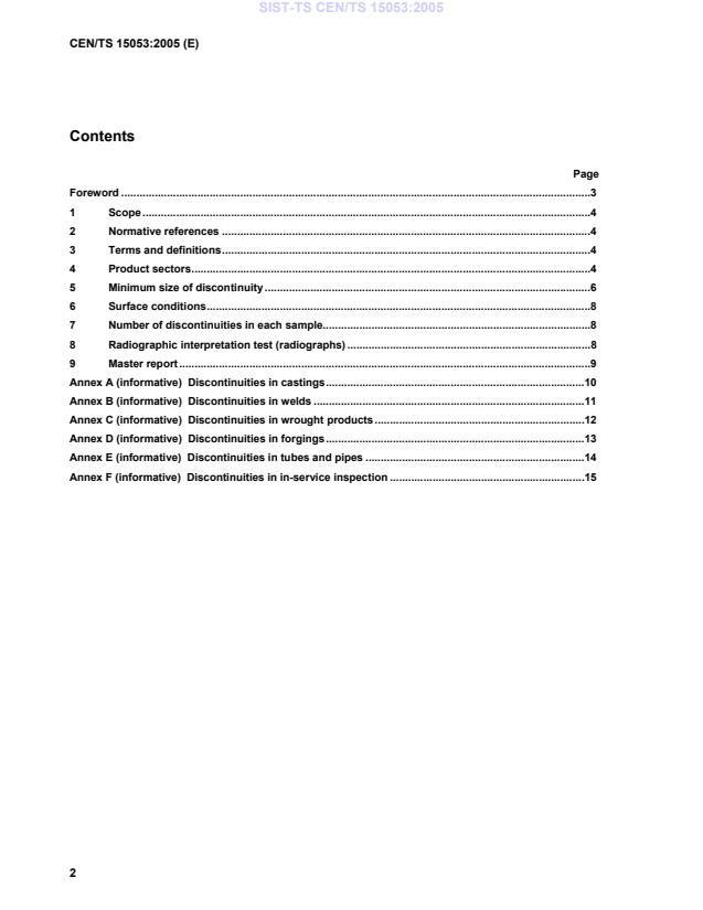 CEN/TS 15053:2005 is a technical specification published by the European Committee for Standardization (CEN). Its full title is "Non-destructive testing - Recommendations for discontinuities-types in test specimens for examination". This standard covers: This Technical Specification is established to consider and define discontinuities-types to be exhibited in test specimens for use in practical Non Destructive Testing examinations. According to EN 473:2000, Clause 7.1.3.3, the discontinuities contains in the test specimens may be natural, artificial or implanted. Acoustic Emission Testing, Infrared Thermography Testing and Leak Testing need not define discontinuity-type, due to their specific approach (e.g. replaced in AT by artificial sources).