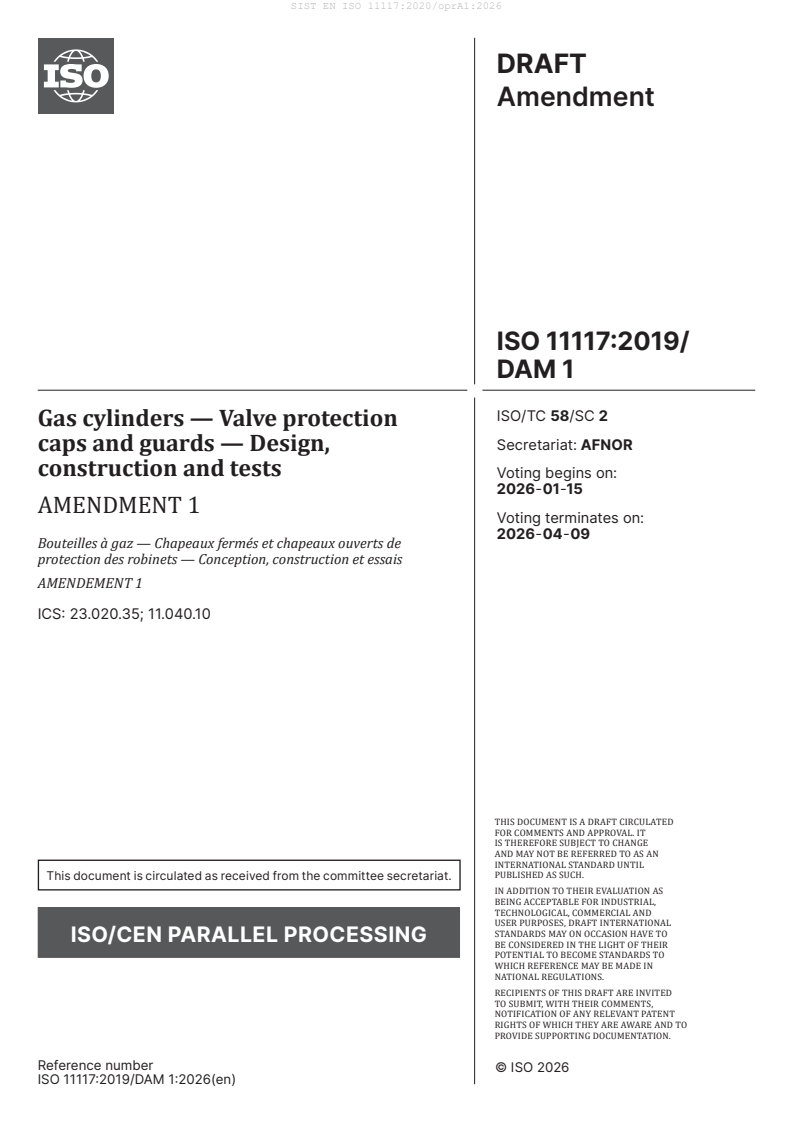 Gas cylinders - Valve protection caps and guards - Design, construction and tests - Amendment 1 (ISO 11117:2019/DAM 1:2026)