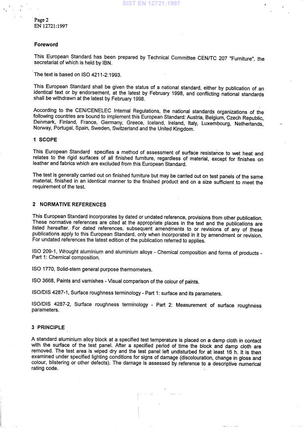 INTERNATIONAL STANDARD ISO 4211-2 First edition 1993-12-01 Furniture - Tests for surfaces - Part 2: Assessment of resistance to vvet heat Ameublement - Essais des finitions de surface - Partie 2: ivalua tion de Ia rksistance a Ia chaleur humide Reference nunher 60 42% 1-2:1993(E) SIST EN 12721:1997