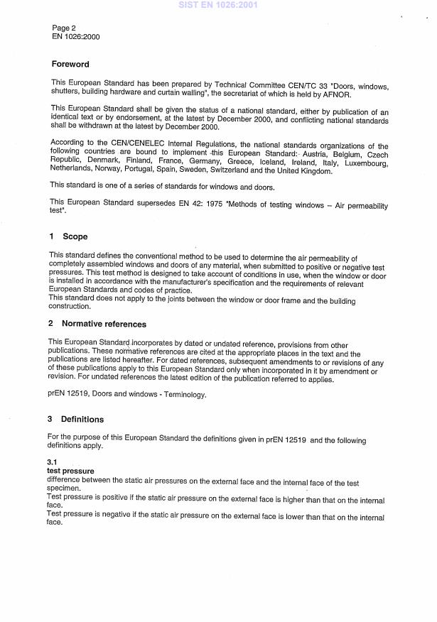 EN 1026:2000 is a standard published by the European Committee for Standardization (CEN). Its full title is "Windows and doors - Air permeability - Test method". This standard covers: This standard defines the conventional method to be used to determine the air permeability of completely assembled windows and doors of any materials, when submitted to positive or negative test pressures. This test method is designed to take account of conditions in use, when the window or door is installed in accordance with the manufacturer's specification and the requirements of relevant European Standards and codes of practice. This standard does not apply to the joints between the window or door frame and the building construction.