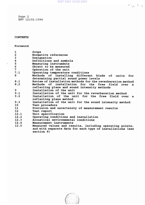 Diese Europäische Vornorm legt Anforderungen fest, nach denen die von Luftkonditionierern, Wärmepumpen oder Entfeuchtern mit elektrisch angetriebenen Verdichtern an die umgebende Luft abgegebenen Geräusche (Parameter: Schalleistungspegel) nach einem genormten Verfahren ermittelt werden. Der in dieser Vornorm verwendete Frequenzbereich liegt zwischen 125 Hz und 4000 Hz. Es werden drei Verfahren zur Ermittlung der Schalleistungspegel angegeben, um unnötige Einschränkungen von vorhandenen Einrichtungen und Erfahrungen zu vermeiden.