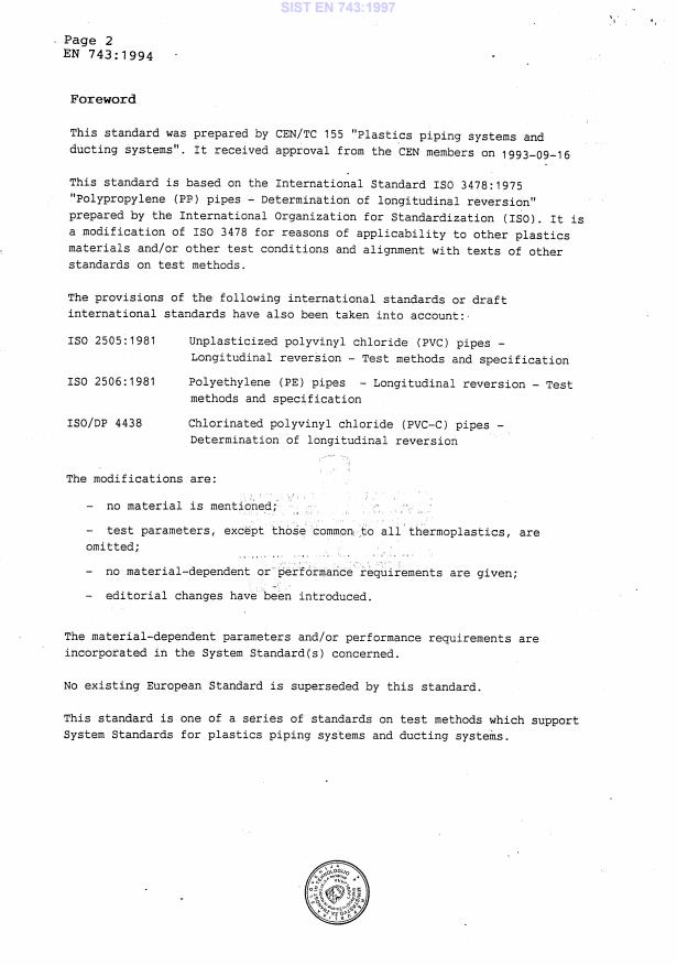 EN 743:1994 is a standard published by the European Committee for Standardization (CEN). Its full title is "Plastics piping and ducting systems - Thermoplastics pipes - Determination of the longitudinal reversion". This standard covers: This standard specifies two methods for determining the longitudinal reversion of cylindrical thermoplastics pipes with smooth surfaces. It provides test methods to be carried out in liquid (method A) or in air (method B).