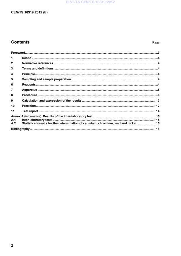This Technical Specification specifies a method for the determination of the content of cadmium, chromium, nickel and lead in fertilizers with inductively coupled plasma atomic emission spectrometry (ICP-AES) after extraction with aqua regia. Limits of quantification are dependent on the sample matrix as well as on the instrument, but can roughly be expected to be 0,3 mg/kg for Cd and 1 mg/kg for Cr, Ni and Pb.