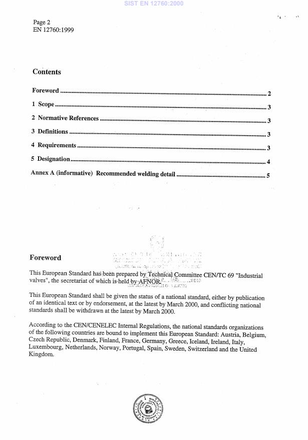 EN 12760:1999 is a standard published by the European Committee for Standardization (CEN). Its full title is "Valves - Socket welding ends for steel valves". This standard covers: This European standard specifies the dimensions of socket welding ends of steel valves designed to be socket welded to standarized pipes in the size range DN 6 to DN 65.