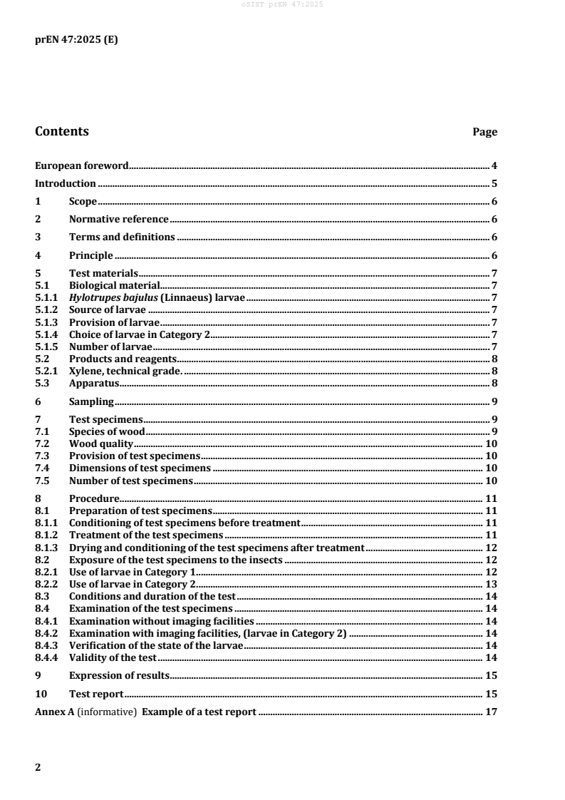 prEN 47 (CEN draft, 2025) is a laboratory standard for assessing the effectiveness of wood preservatives against the larvae of the house longhorn beetle, Hylotrupes bajulus (Linnaeus). The method determines the toxic values (concentration at which larvae do not survive) for preservatives introduced by full impregnation into a susceptible wood species. prEN 47 updates and will supersede EN 47:2016, aligning environmental conditions with related insect test standards and broadening non‑destructive imaging options.