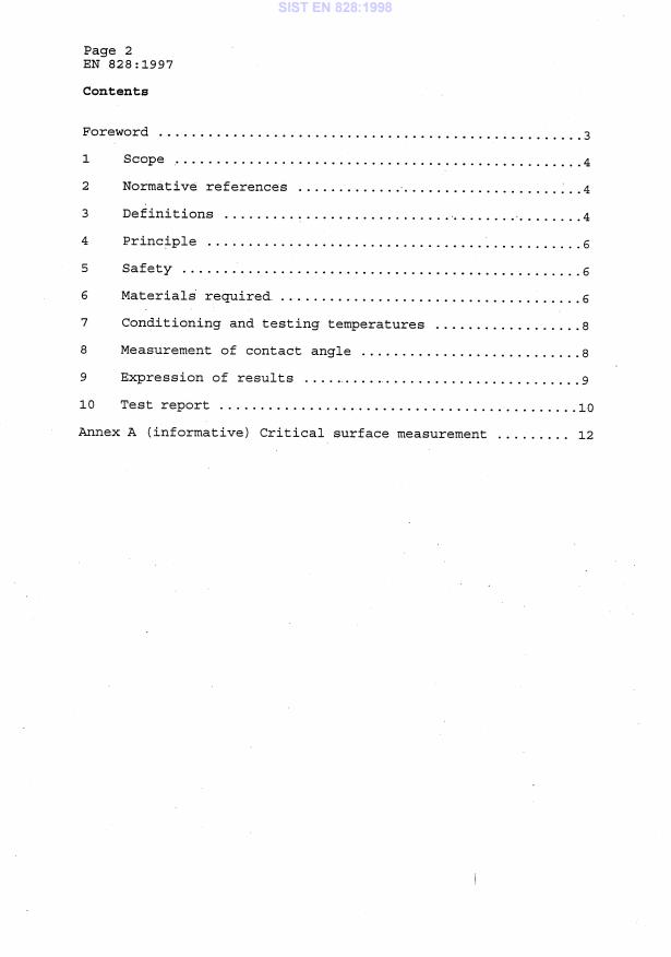 EN 828:1997 is a standard published by the European Committee for Standardization (CEN). Its full title is "Adhesives - Wettability - Determination by measurement of contact angle and critical surface tension of solid surface". This standard covers: This European standard specifies the determination of the ability of an adhesive to "wet" a solid surface by measuring the contact angle and determining the critical surface tension of wettability. It allows the prediction of what adhesive will wet which adherend. It may be used to characterize surfaces after priming, coating and bonding.