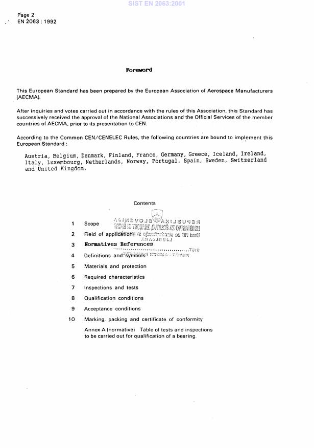 EN 2063:1992 is a standard published by the European Committee for Standardization (CEN). Its full title is "Aerospace series - Airframe rolling bearings - Technical specifications". This standard covers: This standard specifies bearings designed to be subjected under load to slow rotations or oscillations only.