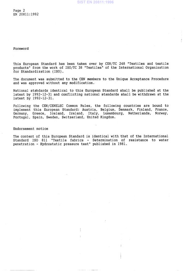 EN 20811:1992 is a standard published by the European Committee for Standardization (CEN). Its full title is "Textiles - Determination of resistance to water penetration - Hydrostatic pressure test". This standard covers: A specimen is subjected to a steadily increasing pressure of water on one face, under standard conditions, until penetration occurs in three places. The water pressure may be applied from below or from above the test specimen. The hydrostatic head supported by a fabric is a measure of the resistance to the passage of water through the fabric.