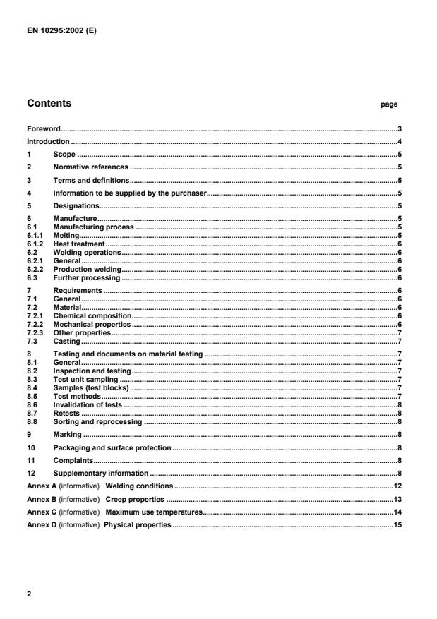 Keywords: EN 10295, heat resistant steel castings, CEN, nickel base alloys, cobalt base alloys, high temperature oxidation resistance, creep properties, welding, chemical composition, mechanical properties.