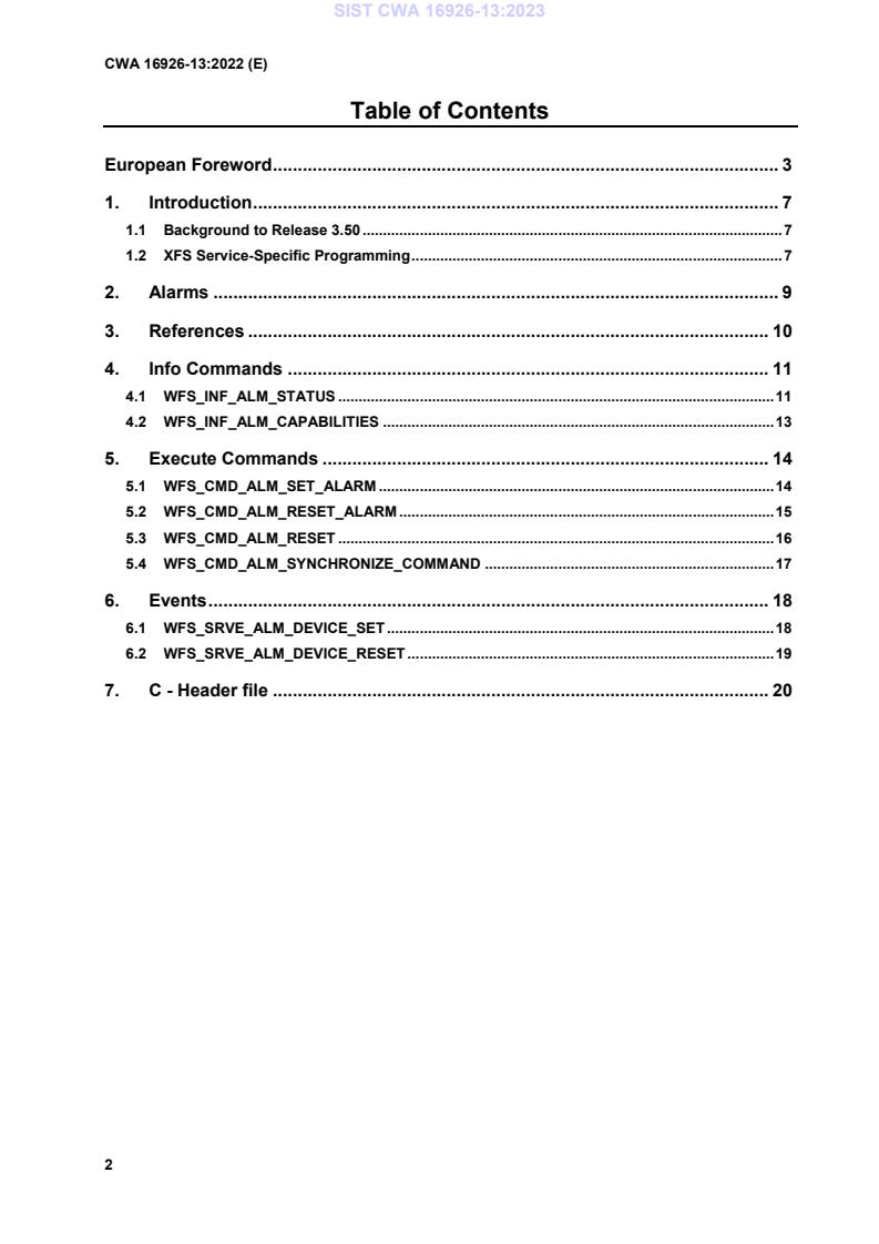 CWA 16926-13:2022 is the CEN Workshop Agreement part of the XFS (eXtensions for Financial Services) Release 3.50 family that defines the Alarm Device Class Interface - Programmer’s Reference. It specifies the service-specific commands, data structures, info and execute functions used by applications and service providers to control alarm devices attached to financial terminals (attended and unattended/self-service). The Alarm class is defined separately so applications can set (trigger) or reset alarms at any time even when related logical services are locked.