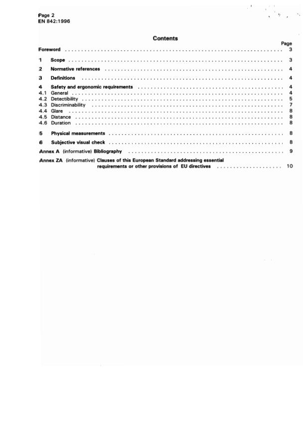 EN 842:1996 is a standard published by the European Committee for Standardization (CEN). Its full title is "Safety of machinery - Visual danger signals - General requirements, design and testing". This standard covers: This European Standard describes criteria for the perception of visual danger signals in the area that people are intended to perceive and to react to such a signal. It specifies the safety and ergonomic requirements and the corresponding physical measurements and subjective visual check. It also provides guidance for the design of the signals to be clearly perceived and differentiated as described in 5.3 of EN 292-2:1991. This European Standard does not apply to danger indicators: - presented either in written or pictorial form; - transmitted by data display units. This European Standard does not apply to special regulations such as those for public disaster and public transport.